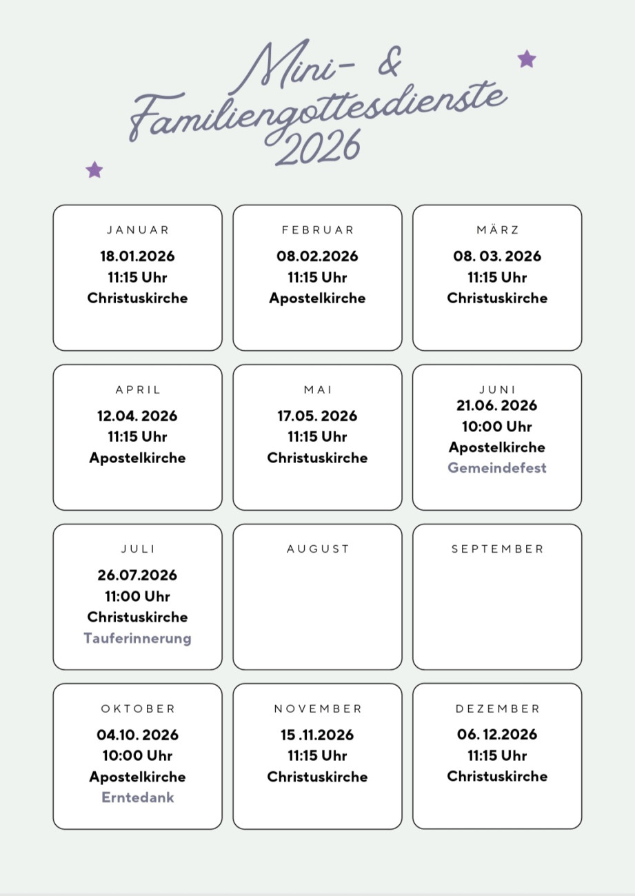 Zur Chaoskirche laden wir Kinder mit ihren Familien ein. Wir feiern einen kurzen Gottesdienst und gehen anschließend zum Basteln und Essen ins Gemeindehaus. Die Chaoskirche findet abwechselnd in der Apostelkirche und der Christuskirche statt.